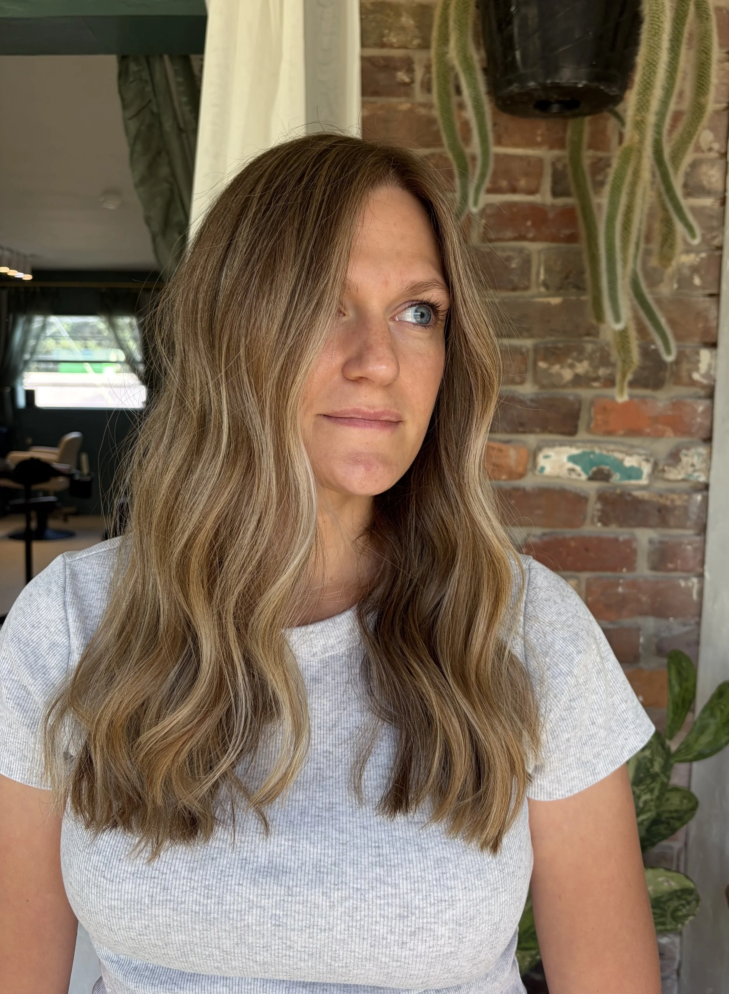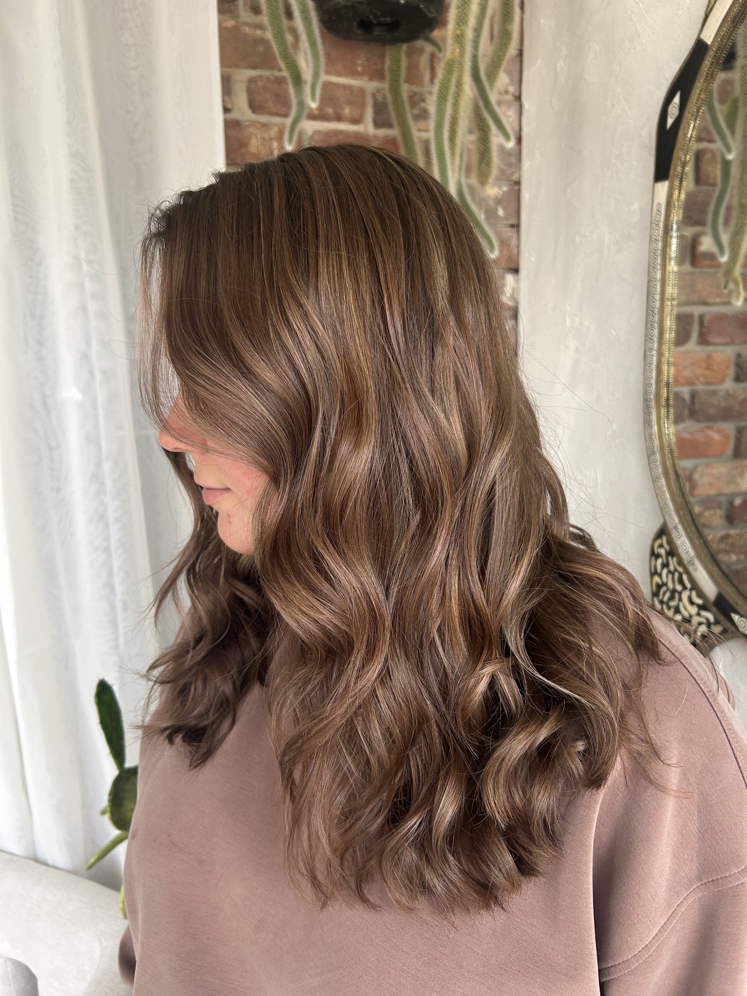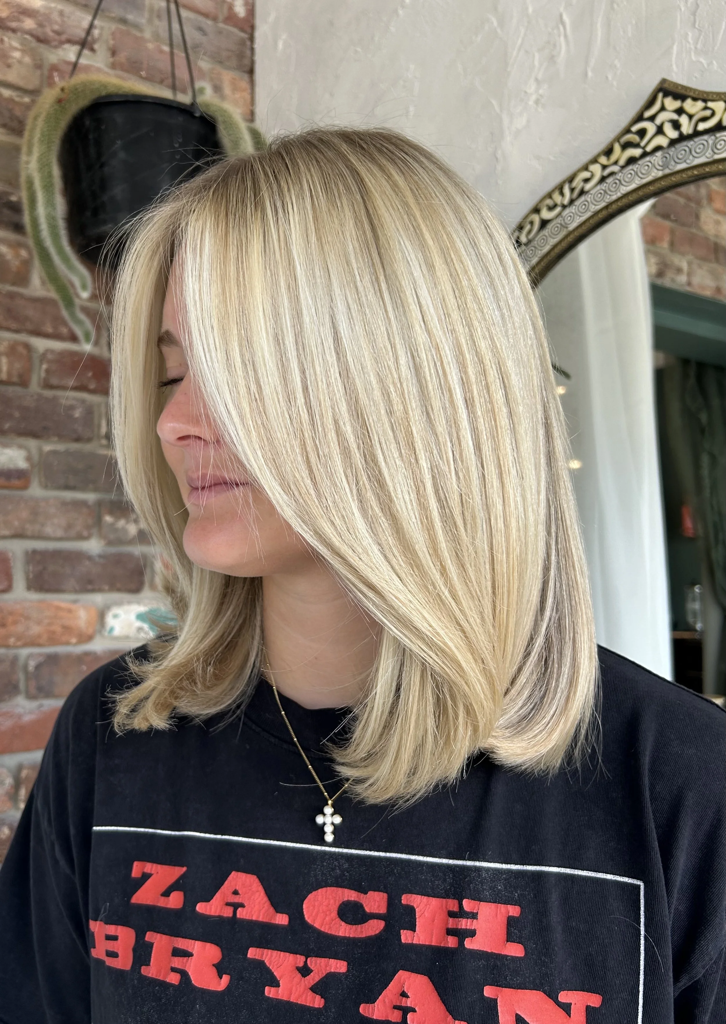Your go-to for that soft, sunlit brightness. This service refreshes dull ends and blends new growth for a smooth, effortless look. Includes a half head of foils, root melt, toner, and a blowout finish. Additional cost of $15 may apply for long or thick hair.